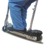 | まずは基本姿勢。イス・ハンドルの高さを調節します。 | 次にスタートスイッチをONにして電源を入れます。そしてイスに座り両足で支えます | アクセルスロットルを回します。スピード調節の強・弱のが簡単に操作できます。 | 両足を乗せ、前に進みます。イスをはずせば普通のキックボードと同じ乗り方が可能です。 |